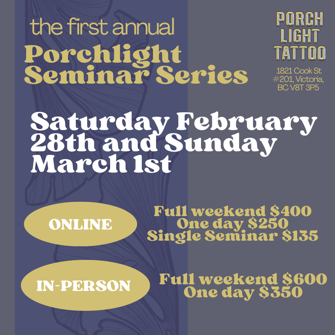 A full weekend of art and education, this seminar series will follow the Annual Porchlight Tattoo Art Show on Friday, Feb 27th from 7pm-12am, themed “Birds and Blossoms”.