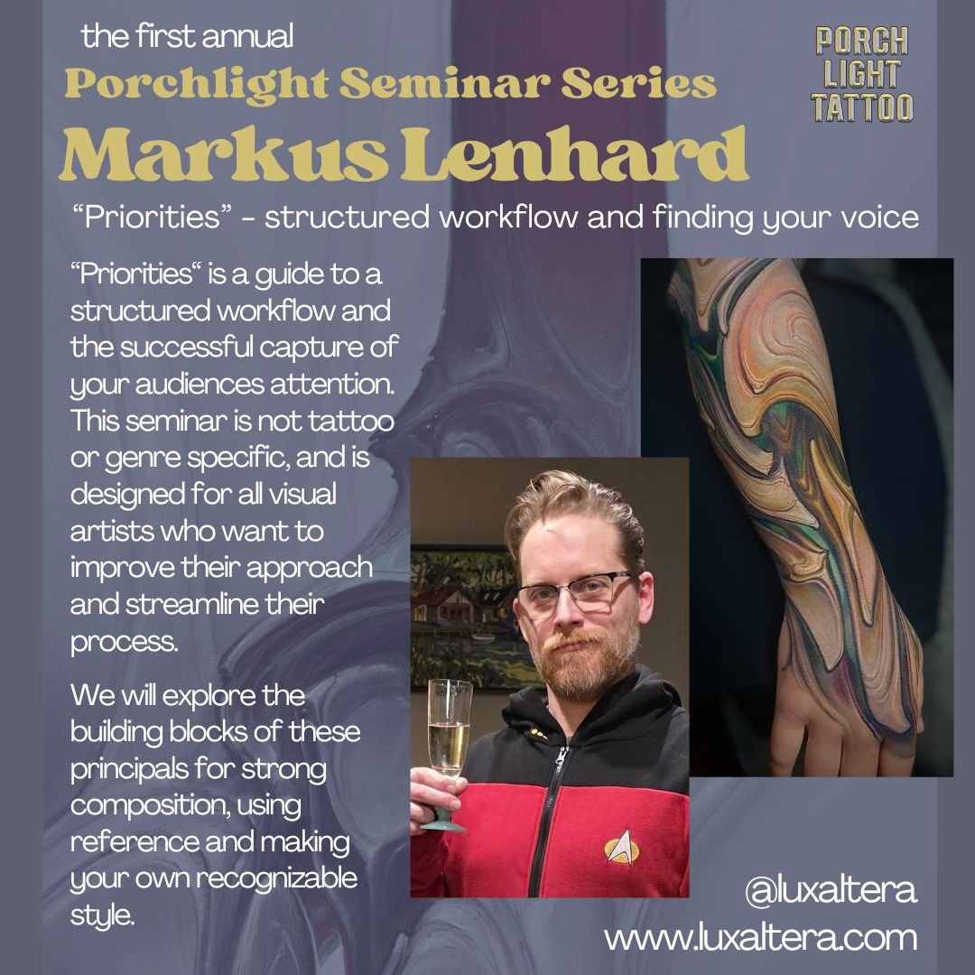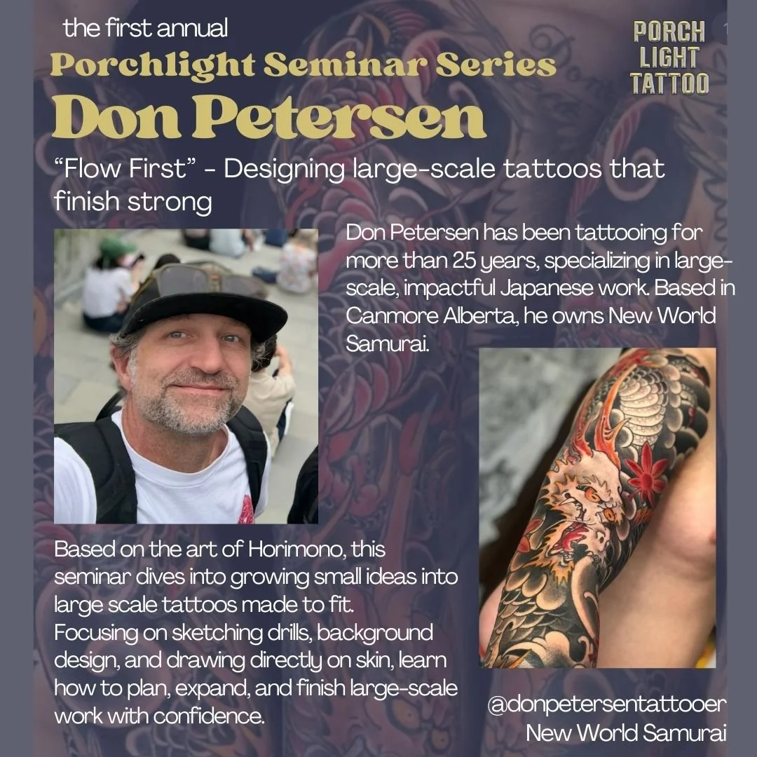 We welcome tattooers and artists of all career lengths, studio environments, skill levels and genres to participate in what promises to be the first in a long line of seminar productions from Porchlight Tattoo.