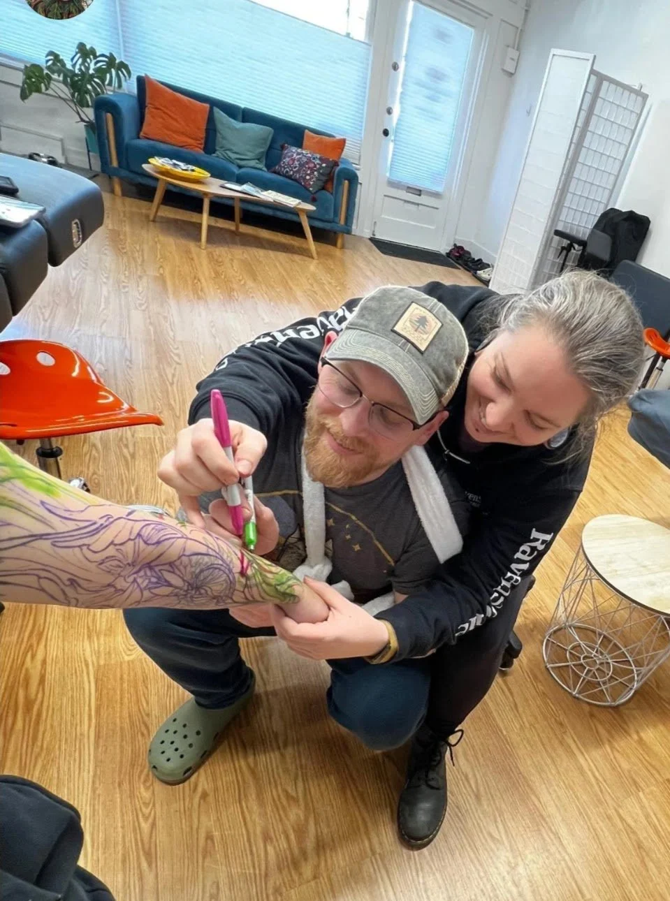 We encourage you to book with either of us based on who you want to interpret your tattoo concept, but where we feel like we really shine, is in collaboration.